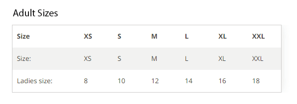 | Size | Child 4-6, Child 7-8, Child 9-10, Child 11-12, Child 13-14, Adult XS, Adult S, Adult M, Adult L, Adult XL, Adult XXL |